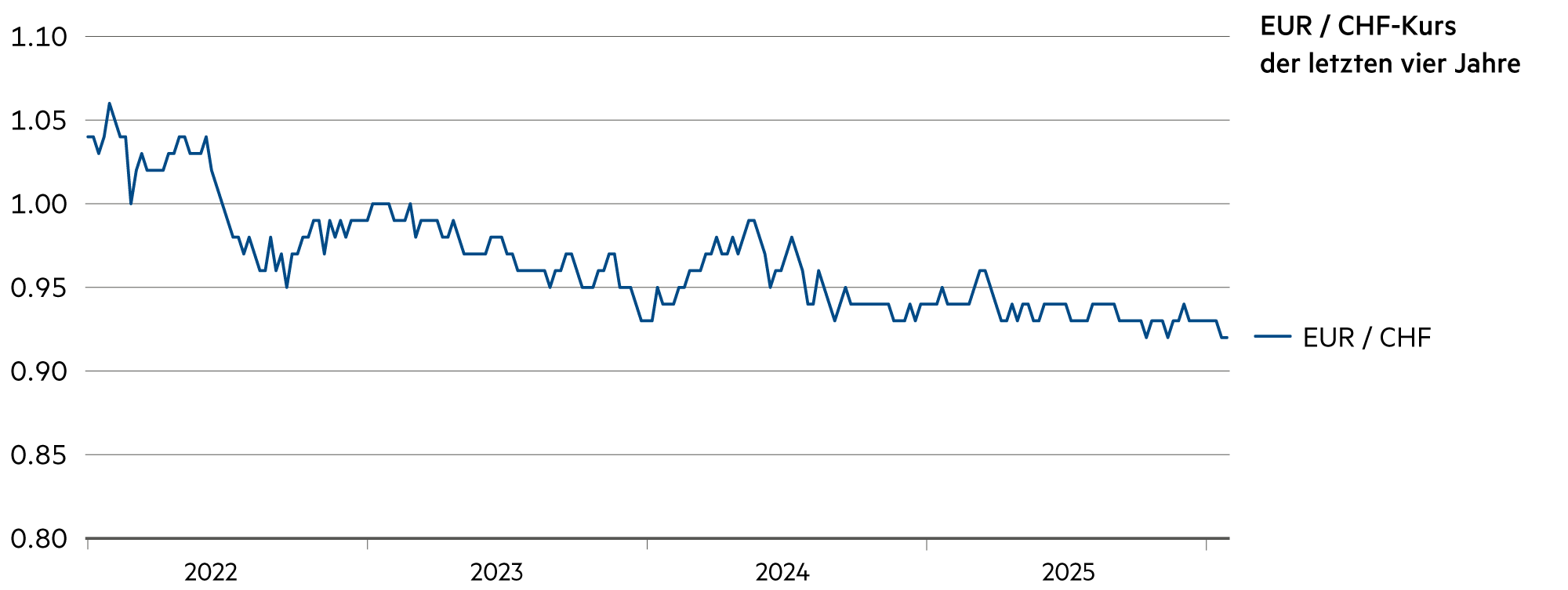 Im Jahr 2026 erwarten wir insgesamt eher wieder einen leicht erstarkten Euro gegenüber dem Franken: 0.95 entspräche auch etwa der Kaufkraftparität. |